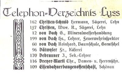 1909 Telefon-Anschluss, im damals rund 2600 Einwohnerzählenden Lyss der sechzigste Anschluss. Das Telefon wurde jedoch nur morgens um 7.00 Uhr, mittags um 12.00 Uhr und abends ab 18.00 Uhr bedient.