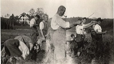1932 Hans von Dach mit Mitarbeitern beim Okulieren. Verbunden wurde mit Bast.