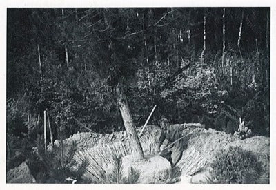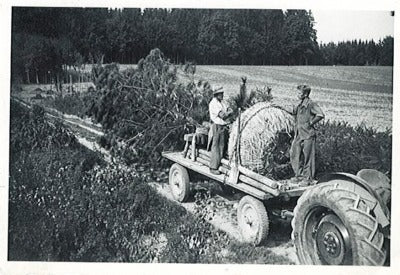 1947 wurde der erste Traktor der Marke ‘Fordson‘ gekauft. Er wurde vorwiegend zum Gütertransport eingesetzt. Hans von Dach links und Otto Howald rechts, sind glücklich, die Föhre mit dem Dreibein und Flaschenzug auf dem Anhänger zu haben.