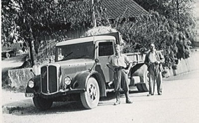 Transport nach Bassecourt mit dem ‘Grossen Saurer-Lastwagen‘. Stolz posieren für die Fotografie links Otto Howald, rechts Ernst Bleuer.